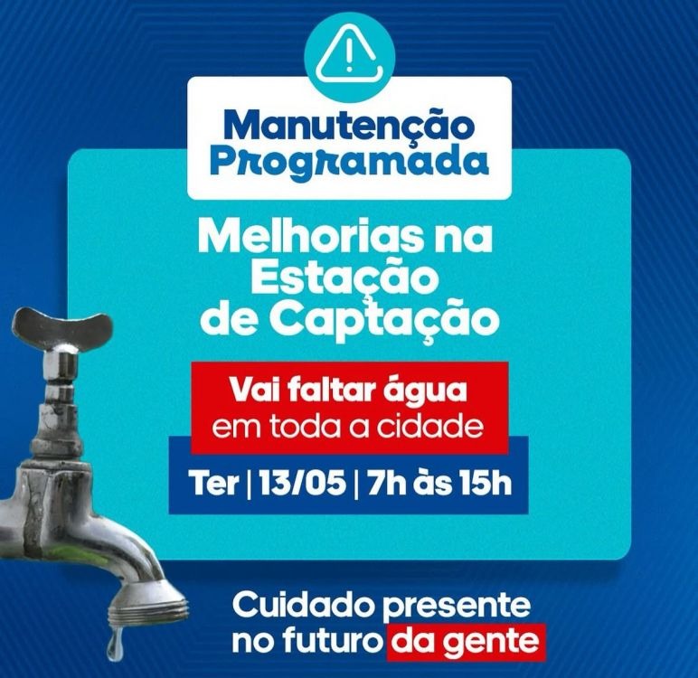O Serviço de Água e Saneamento Ambiental (SAAE) de Juazeiro informou que realizará uma manutenção programada na Estação de Captação nesta terça-feira (13) das 7h às 15h. Durante esse período, o fornecimento de água será temporariamente suspenso em toda a cidade.