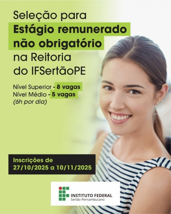 O Instituto Federal do Sertão Pernambucano (IFSertãoPE) divulgou, nesta segunda-feira (20), o Edital nº 119/2025, que regulamenta o processo seletivo para estágio remunerado destinado a estudantes de níveis médio e superior. As inscrições estarão abertas de 27 de outubro a 10 de novembro, por meio de formulário eletrônico disponível no site oficial do Instituto. É importante que todos os documentos exigidos no item 3.2.4 do edital sejam anexados no momento do preenchimento do formulário.
